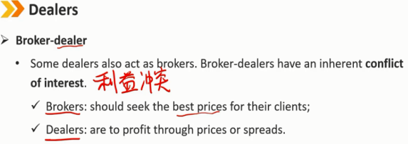 经纪商兼做市商: 一些做市商还充当经纪商。经纪-做市商有着内在的利益冲突。 经纪商:应该为他们的客户寻求最好的价格 做市商:通过价格或价差获利