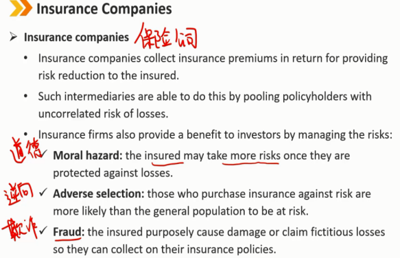 保险公司收取保险费,作为为被保险人降低风险的回报。 这类中介机构可以通过将具有不相关损失风险的投保人集中起来实现这一点 保险公司还通过管理风险为投资者带来好处 - 道德风险:一旦被保险人受到损失保护,他们可能会承担更多的风险 - 逆向选择:购买风险保险的人比一般人群更可能处于风险之中 - 欺诈:被保险人故意造成损害或索赔虚构的损失,以便他们可以在保单上收取费用
