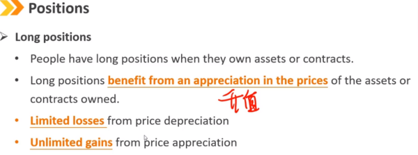空头头寸: 卖空者通过从证券贷款人处借入证券来建立证券空头头寸 - 第一步向贷款人借入证券 - 第二步立即出售借入证券 - 第三步证券价格下跌后回购证券 - 第四步向贷款人返还证券 空头头寸受益于所售资产或合同价格的下降 价格贬值的潜在收益有限 价格升值带来的潜在损失无限