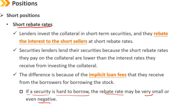 3、空头回扣率 出借人将抵押品投资于短期债券,并以空头回扣率将利息回扣给卖空者 证券出借人出借他们的证券是因为他们为抵押品支付的短期回扣率低于他们从投资抵押品中获得的利率 这种差异是因为他们从借贷者那里获得了借出股票的隐性贷款费用 如果证券很难借入,那么回扣率可能非常小,甚至为负值