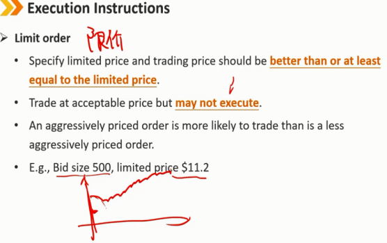 限价指令 指定限定价格,交易价格应优于或至少等于限定价格 以可接受的价格进行交易,但可能无法执行 积极定价的订单比不太积极定价的订单更有可能进行交易 例如,买入规模500,限价$11.2