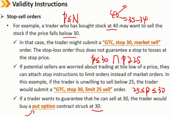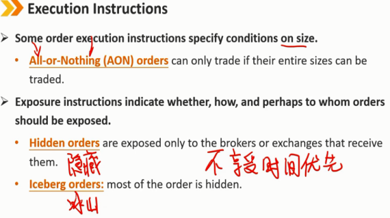 Day orders:只在提交之日内有效 Good-till-cancelled orders(GTC):订单取消前一直有效(我国没有) Immediate or cancel orders(IOC)/ Fill or kill orders: - 仅在经纪人或交易所收到后有效 - 除非可以立即成交,否则将被取消 Good-on-close orders:只能在即将收盘前按市价成交 Good-on-open orders:仅在开盘后几分钟按市价成交