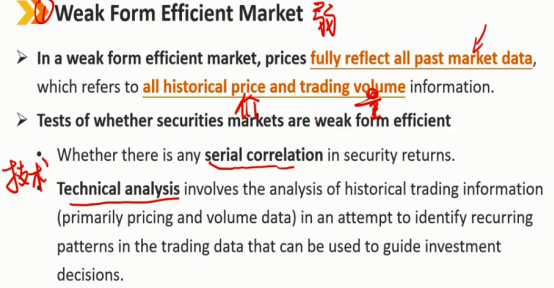弱式有效市场: 在弱式有效市场中,价格充分反映所有过去的市场数据,即所有历史价格和交易量信息。 检验证券市场是否是弱有效市场的方法: - 证券的收益是否与历史价格和交易量存在任何线性回归关联 - 技术分析包括对历史交易信息的分析(主要是定价和交易量数据)试图确定交易数据中可用于指导投资决策的重复图形