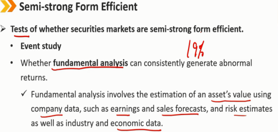 检验证券市场是否是半强式有效的方法: - 事件研究 - 基本面分析是否能够持续产生超额回报 基本面分析涉及使用公司数据(如盈利和销售预测、风险估计以及行业和经济数据)对资产价值的估计 如果能通过公开的事件或者公司数据持续获得超额收益,说明市场没有达到半强式有效。