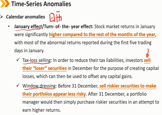 1月效应/年度交替效应:1月份的股市回报率明显高于今年其他月份,大部分异常回报率在1月份的前五个交易日报告。 原因是: - 税务损失出售:国外股票交易盈利要交资本利得税,为了减少其税务负债,投资者在12月出售其“亏损”证券,以创造资本损失,然后可用于抵消其资本利得税。 - 窗口的展示:12月31日前,出售风险较高的证券,使其投资组合看起来风险较低。12月31日之后,投资组合经理只需购买风险更高的证券,以获得更高的回报。或者有的基金经理是做价值股的,但是为了短期排名或者收益,最近成长股或科技股涨的好,他就调整了持仓,但是年底披露的时候为了不违背他承诺的投资方向,就会出现一波股票的出售,等过年披露完再买回来。