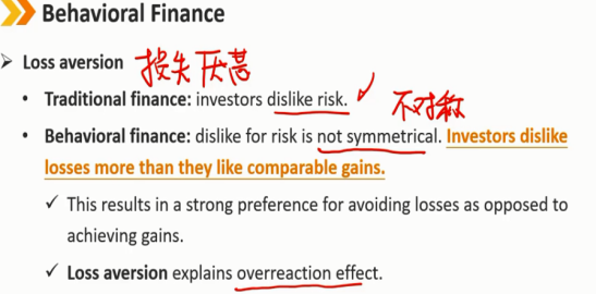 损失厌恶解释了过度反应效应,人们在盈利时往往想挣的更多,而不是厌恶风险。