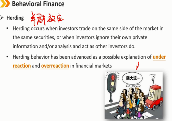 羊群效应 当投资者在同一证券市场的同一侧交易时,或者当投资者忽略自己的私人信息和/或分析,并像其他投资者那样行事时,就会发生羊群效应。 羊群行为被认为是金融市场反应不足和反应过度的可能解释。