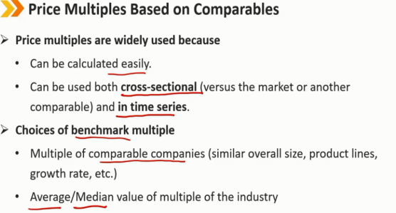 价格乘数之所以被广泛使用,是因为 - 容易计算 - 可用于横截面(与市场或其他可比数据)和时间序列数据 基准乘数的选择 - 多家可比公司(类似的总体规模、产品线、增长率等) - 行业乘数的平均值/中位数