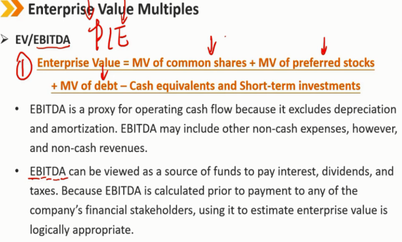 企业价值乘数: EV / EBITDA EV = 普通股的MV + 优先股的MV + 债务的MV - 现金及等价物和短期投资 息税折旧摊销前利润是经营现金流的代表,因为它不包括折旧和摊销。然而,息税折旧摊销前利润可能包括其他非现金费用和非现金收入。 息税折旧摊销前利润可被视为支付利息、股息和税费的资金来源。由于息税折旧摊销前利润是在向公司的任何财务利益相关者付款之前计算的,因此使用息税折旧摊销前利润来估算企业价值在逻辑上是合适的。