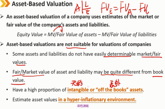 基于资产的公司估值使用对公司资产和负债的市场或公允价值的估计,是基于当前时点的估计,没有考虑公司未来的发展情况 权益价值 = MV或资产公允价值 - MV或负债公允价值 基于资产的估值不适用于公司估值的情况: - 某些资产和负债的市场/公允价值不易确定。 - 资产和负债的公允/市场价值可能与账面价值大不相同。 - 拥有较高比例的无形资产或“表外”资产。 - 在极度通货膨胀的环境下估计资产价值。