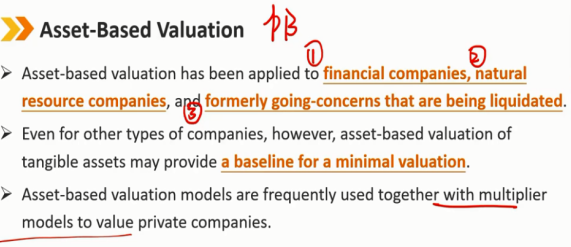 基于资产的估值常应用于金融公司(很多金融资产有账面价值)、自然资源公司(资产好估计)和正在清算的以前经营中的公司(正好不用考虑公司未来发展)