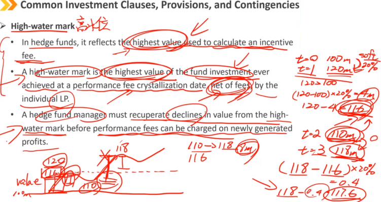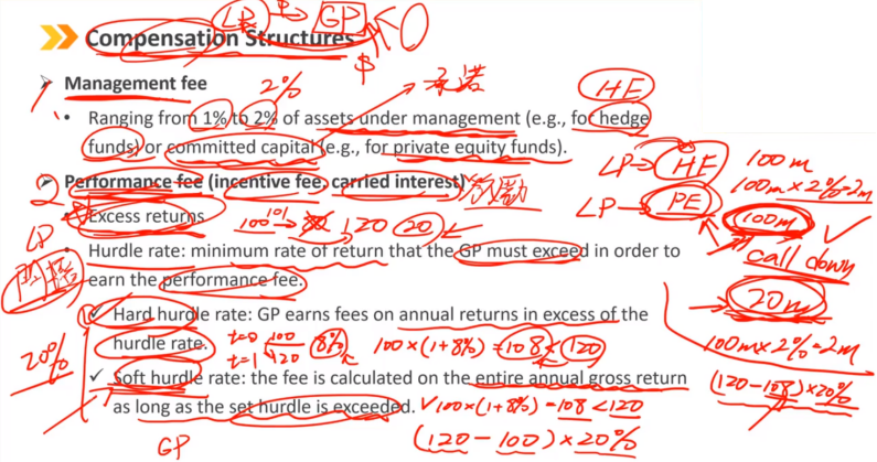 管理费: 管理资产(如对冲基金)或承诺资本(如私募股权基金)的1%至2%不等。 LP -> HF:投入对冲基金100m,按2%计算,管理费是2m LP -> PE:承诺投入PE是100m,但是目前实际支付了20m(call down),按2%计算,管理费也是2m,此时得用承诺资本100m计算,而不能用实际支付的 业绩费(激励费、附带权益): 获得超额收益时可以收取 门槛率:GP必须超过的最低回报率,以赚取绩效费。 硬门槛率:GP的年回报率超过门槛率时赚取费用。 软门槛率:只要超过设定的门槛,费用就按整个年度总回报计算。 例如:本金100,投资1年后变为120,门槛率设置为8%,绩效费比率20% 门槛率:100*(1+8%)=108,此时120>108,所以可以收取绩效费 硬门槛率下可以获得的绩效费:(120-108)*20%,即总金额减去门槛率算出来的费用作为计算基础 软门槛率下可以获得的绩效费:(120-100)*20%,即总金额减去初始本金作为计算基础