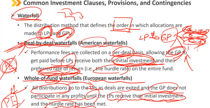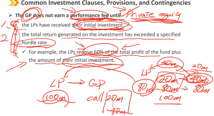 共同投资条款和或有事项: GP不收取业绩费,直到:(以下主要是针对私募股权PE投资的条款) 1、有限合伙人已经收到了他们的初始投资。 2、投资产生的总回报已超过指定的最低回报率。 例如,有限合伙人获得基金总利润的60%加上其初始投资额。