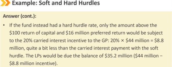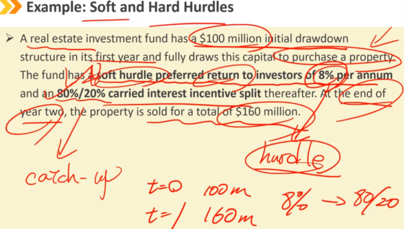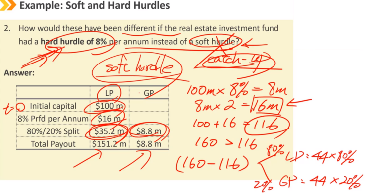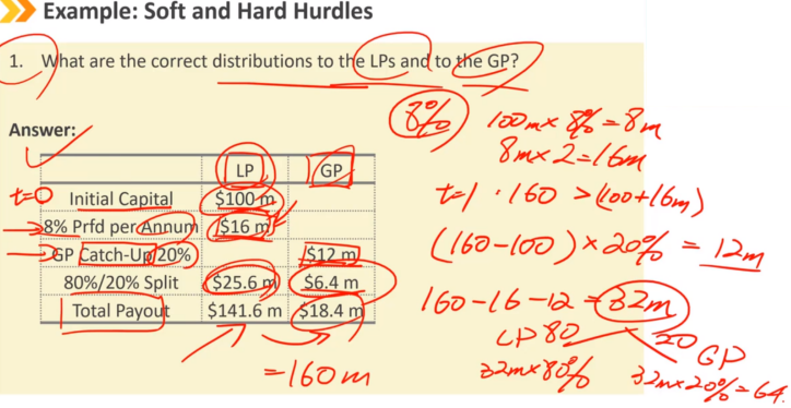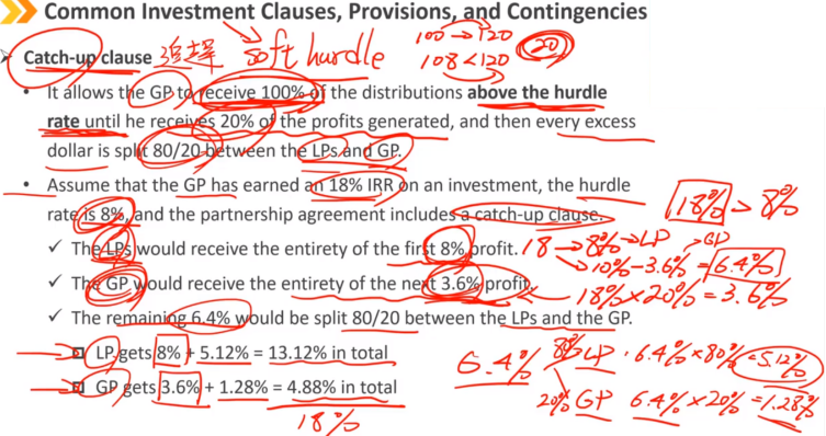 追赶条款: 它允许普通合伙人在高于最低门槛率时获得100%的利润分配(类似soft hurdle),直到他获得20%的利润,然后超出最低门槛率的部分每多出一美元在有限合伙人和普通合伙人之间按80/20分成。 假设GP在一项投资中获得了18%的内部收益率,最低回报率为8%,并且合伙协议中包含了追赶条款。 有限合伙人将获得前8%的全部利润。(8%是最低回报率) GP将获得未来3.6%的全部利润。(18% * 20% = 3.6%) 剩余的6.4%将在LPs和GP之间分成80/20。(10% - 3.6% = 6.4%) LP总共获得 8% + 5.12% = 13.12%(6.4% * 80% = 5.12%) GP总共获得 3.6% + 1.28% = 4.88%(6.4% * 20% = 1.28%)
