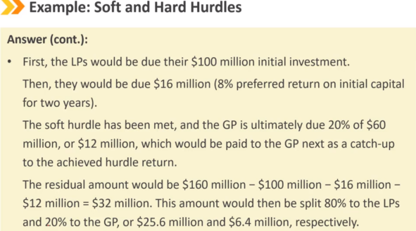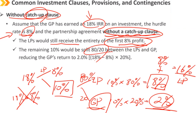 无追赶条款: 假设GP在一项投资中获得了18%的内部收益率,最低回报率为8%,并且合伙协议中没有追赶条款。 有限合伙人仍将获得前8%的全部利润。 剩余的10%将在LPs和GP之间按80/20分成,GP的回报率降低到2.0%。[(18% - 8%)* 20% ]