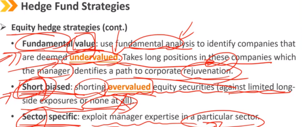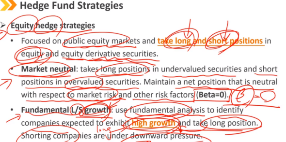 权益对冲策略: 专注于公开股票市场,在股票和股票衍生证券中持有多头和空头头寸。 1、市场中性:持有低估证券的多头头寸和高估证券的空头头寸。保持与市场风险和其他风险因素相关的中性净头寸(β=0) 2、基本面L/S成长(偏向于公司成长性):使用基本面分析确定预期表现出高成长的公司,进行多头头寸,买入这些公司股票,对面临下行压力的公司进行空头头寸,卖出股票。