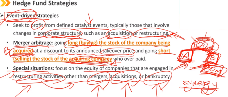 事件驱动型策略: 寻求从确定的催化事件中获利,通常是那些涉及公司结构变化的事件,如收购或重组。 1、并购套利:以低于被收购价格做多(买入)该公司股票,卖空(卖出)多付的收购方公司的股票。 2、特殊情况:关注参与除合并、收购或破产以外的重组活动的公司的股权。