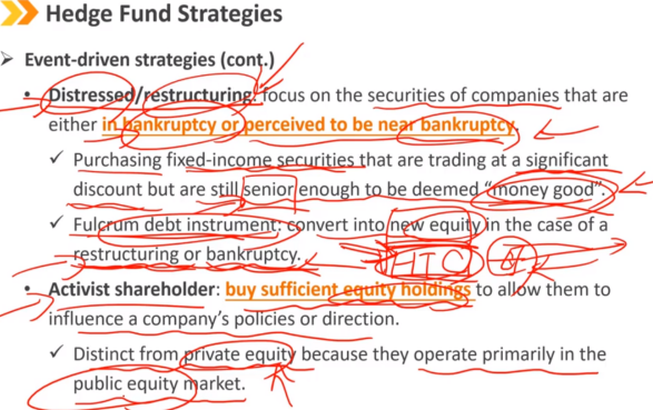 事件驱动策略(续): 3、困境/重组:关注处于破产或被认为接近破产的公司的证券。 购买这些公司的固定收益债券,这些债券以显著的折扣进行交易,但其偿付级别仍然足以被视为“优先级很好”的。 支点债务工具:在重组或破产的情况下会转换为新股权,例如母公司快倒闭了,但是其某个板块很挣钱,此时可能会将这部分剥离成立一个新的子公司,于是将股权转换到这个挣钱的子公司获得更好的收益。 4、积极股东:购买足够的股票,使其能够影响公司的政策或方向,从而自己做出对自己有利的公司决策。 与私募股权不同,因为它们主要在公开市场操作的。