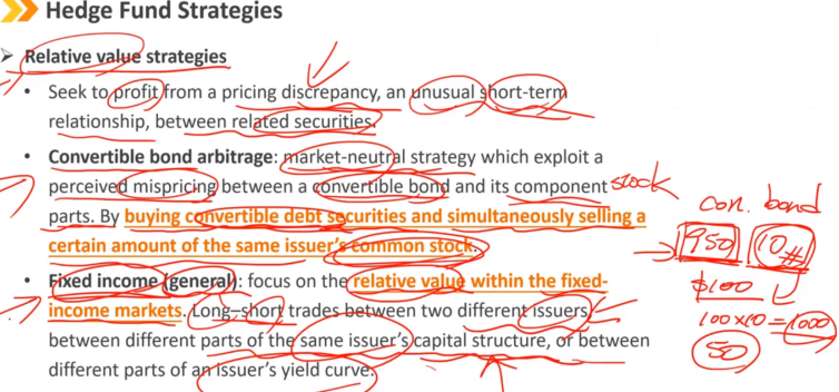 相对价值策略: 寻求从相关证券之间的定价差异中获利,这是一种不寻常的短期关系。 1、可转换债券套利:利用可转换债券及其组成部分之间的错误定价的市场中立策略。通过购买可转换债务证券,同时出售同一发行人的一定数量的普通股。 2、固定收益(一般债券):关注固定收益市场的相对价值。两个不同发行人之间、同一发行人资本结构不同部分之间或发行人收益率曲线不同部分之间的买卖交易。