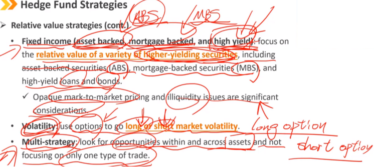 相对价值策略(续): 3、固定收益(资产支持、抵押贷款支持和高收益债券):关注各种高收益证券的相对价值,包括资产支持证券(ABS)、抵押贷款支持证券(MBS)以及高收益贷款和债券。 不透明的市值计价和低流动性问题是重要的考虑因素。 4、波动性:使用期权对市场波动性进行多头空头预测。 5、多重策略:在资产内部和资产之间寻找机会,而不是只关注一种类型的交易。