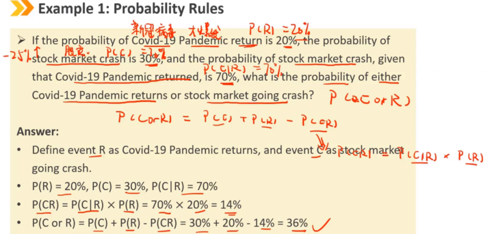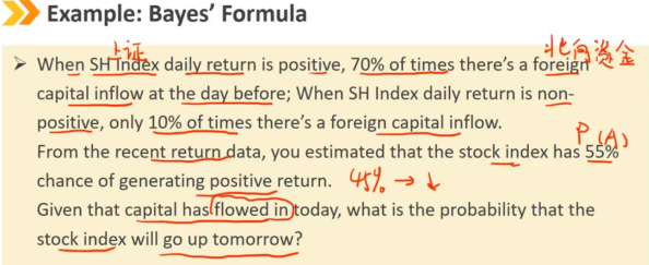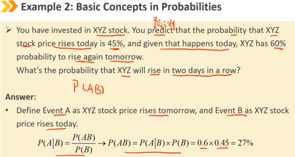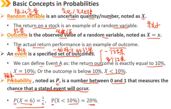 随机变量是一个不确定的量/数,记为X。 股票收益率是随机变量的一个例子。 结果是随机变量的观察值,表示为X=x。 实际收益表现就是结果的一个例子。 事件是一组特定的结果。 我们可以将事件A定义为:返回结果正好等于10%,X=10%:或结果低于10%,X<10%。 概率,以P表示,是一个介于0和1之间的数字,用于衡量所述事件发生的可能性。