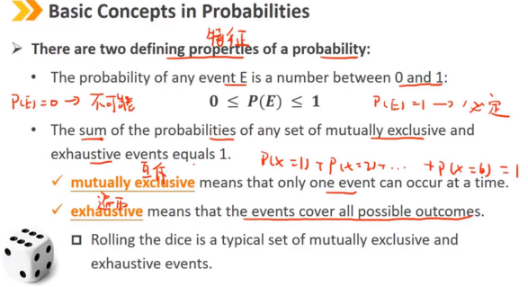 概率有两个定义性质: 任何事件E的概率是一个介于0和1之间的数字。 0 ≤ P(E) ≤ 1 任何一组互斥和遍历事件的概率之和等于1。 互斥意味着一次只能发生一个事件 遍历意味着事件涵盖了所有可能的结果 掷骰子是一组典型的互斥且遍历的事件