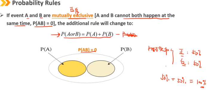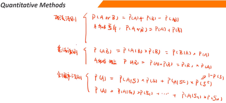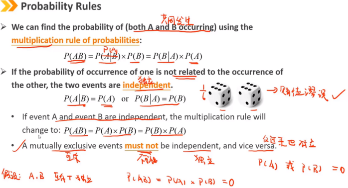 乘法法则:A和B同时发生时使用 两个事件独立:一个事件发生的概率与另一个事件发生的概率不相关 事件A的条件概率 = 事件A的非条件概率 如果事件A和事件B独立,则乘法法则可以表示为:P(AB) = P(A) × P(B) = P(B) × P(A) 互斥事件不可能是独立事件,反之亦然