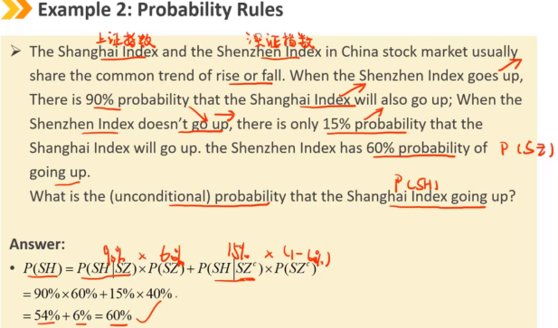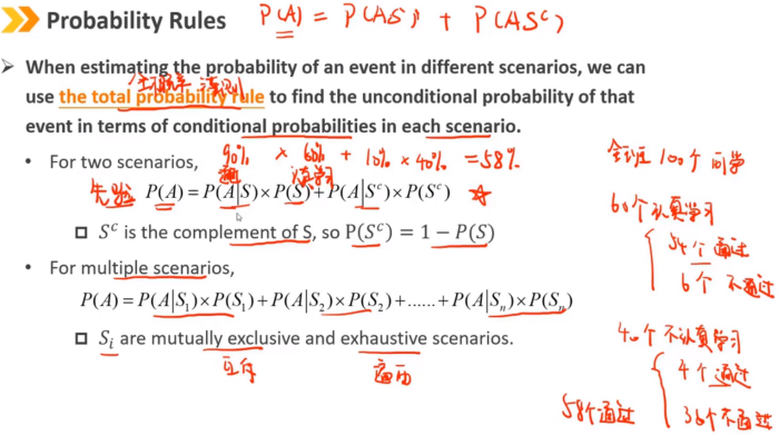 全概率法则:通过每个场景下某个事件的条件概率得到该事件的非条件概率的方法