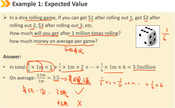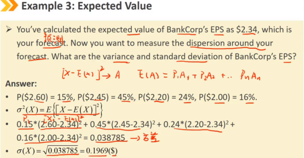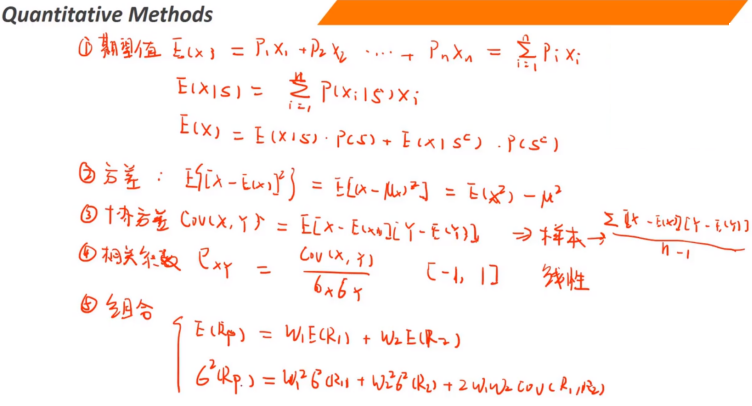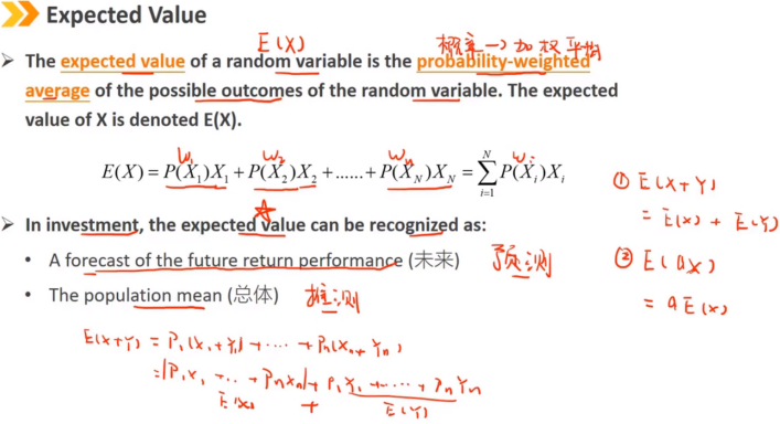 期望:随机变量所有可能结果以各自发生概率作为权重的加权平均数。 再投资中,期望可以: 1、预测未来的收益率 2、通过样本对总体进行推测 期望的两个性质: 1、E(X+Y) = E(X) + E(Y) 2、E(aX) = aE(X)
