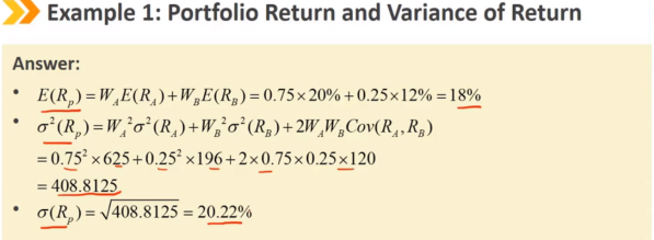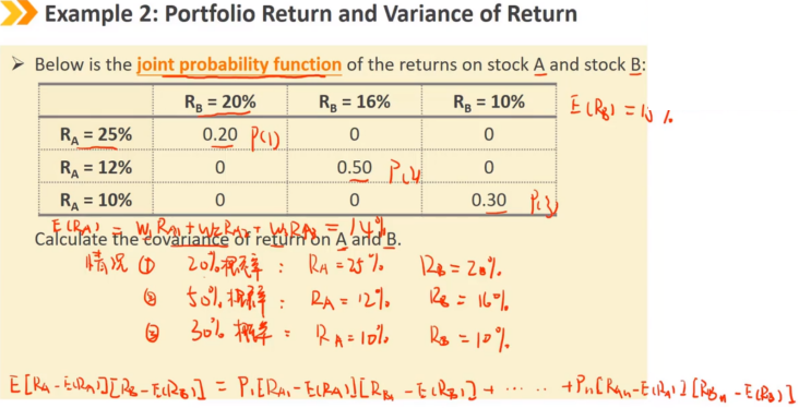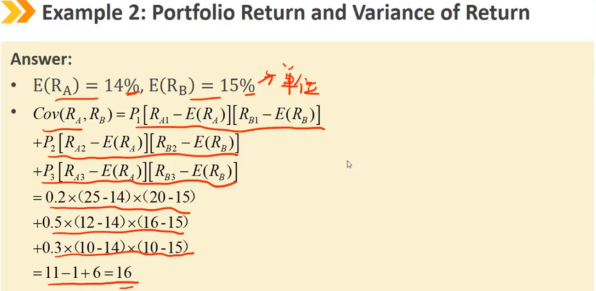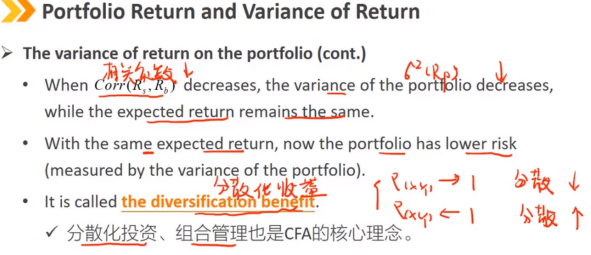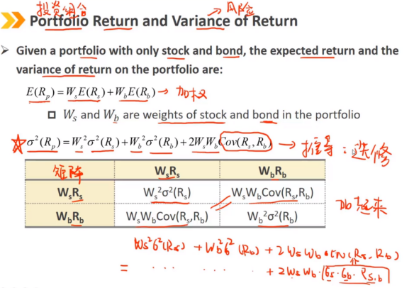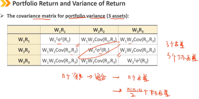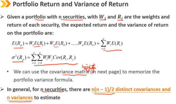 n个资产组合的收益率和方差 对于n项资产的组合,共有n个方差和n(n-1)/2个协方差