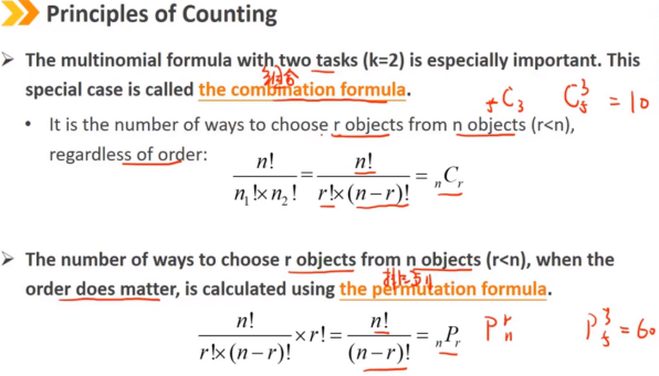 多项公式有两项任务时,称作组合公式:nCr 从n个物品中抽出r个物品(r<n),不考虑顺序 从n个物品中抽出r个物品(r<n),考虑顺序,则使用排列公式:nPr