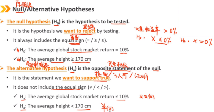原假设(H0)是要检验的假设。 这是我们想要通过检验来拒绝的假设 它总是包含等号(=/≥/≤) H0:全球股市平均回报率=10% H0:平均身高≥170cm 备择假设(Ha)与原假设相反。 这是我们想要接受的假设 它不包括等号(≠/</>) Ha:全球股市平均回报率≠10%(双向) Ha:平均身高<170cm(单向)