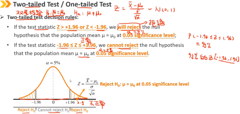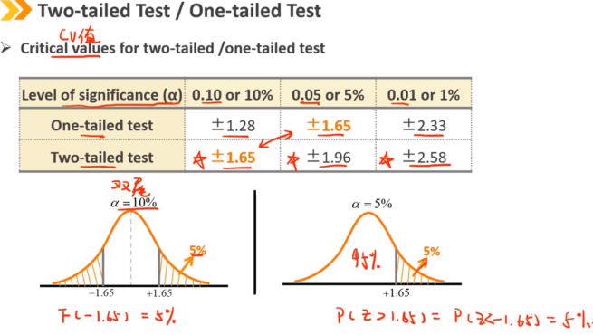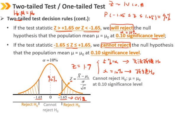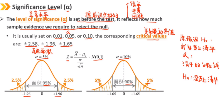 显著性水平(α)在检验之前设置的,它反映了我们需要多少样本证据来拒绝原假设。 通常设置为0.01、0.05或0.10,相应的临界值为:±2.58、±1.96、±1.65