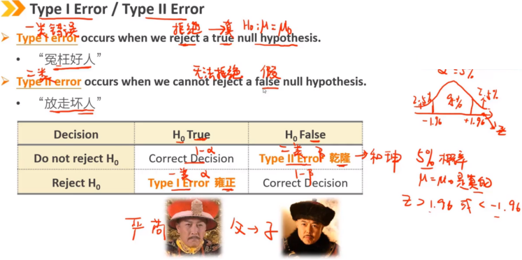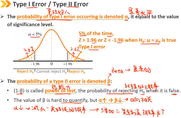Ⅰ类错误的出现是我们拒绝了一个为真的原假设(原假设是真的,但是我们拒绝了) Ⅱ类错误的出现是我们无法拒绝一个为假的原假设(原假设是假的,但是我们无法拒绝) 原假设为True时,对应的是α和1-α 原假设为False时,对应的是β和1-β