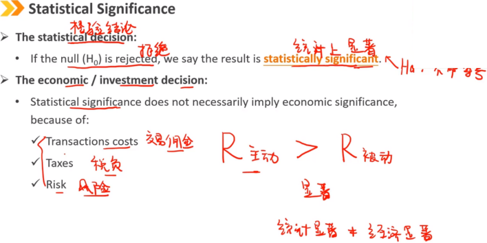 统计检验结论: 如果拒绝原假设,我们称该结果在统计上显著 经济/投资结论: 统计显著不代表经济显著,因为现实中存在交易成本、税负、风险