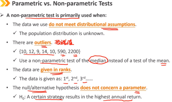 使用非参数检验的情况: 1、数据不满足分布假设 总体的分布情况未知 2、存在极端值 对中位数使用非参数检验替代对均值的检验 3、数据是序数 4、原假设和备择假设不是关于参数的 原假设:某个策略是能带来最高年收益率的