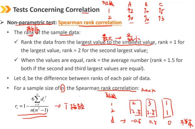 非参数检验:斯皮尔曼相关系数检验 样本数据排序: 将数据从最大值排序到最小值,最大值为1,第二大值为2; 当值相等时,排名=平均数(如果第二大值和第三大值相等,则两者的秩均为1.5) 设d为每对数据排名之间的差 样本容量为n的斯皮尔曼相关系数公式如下: