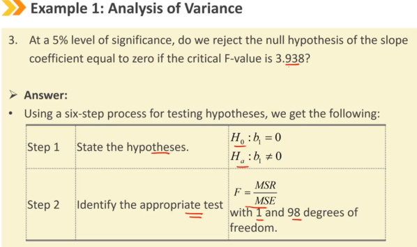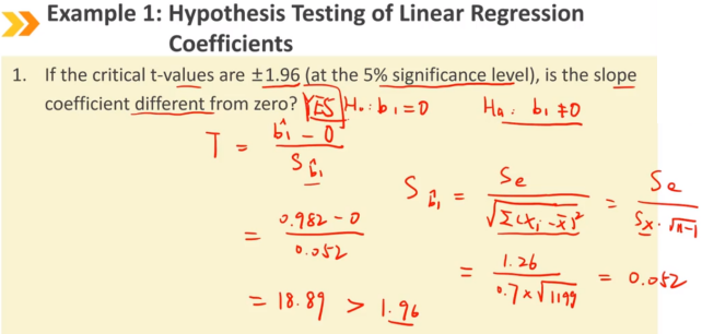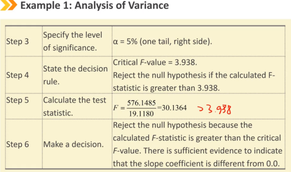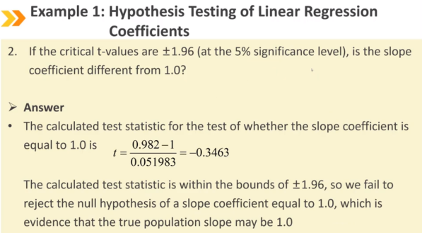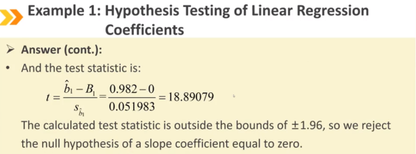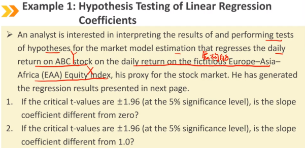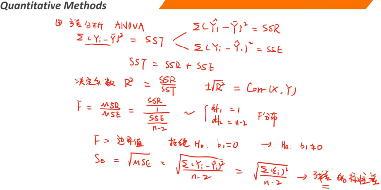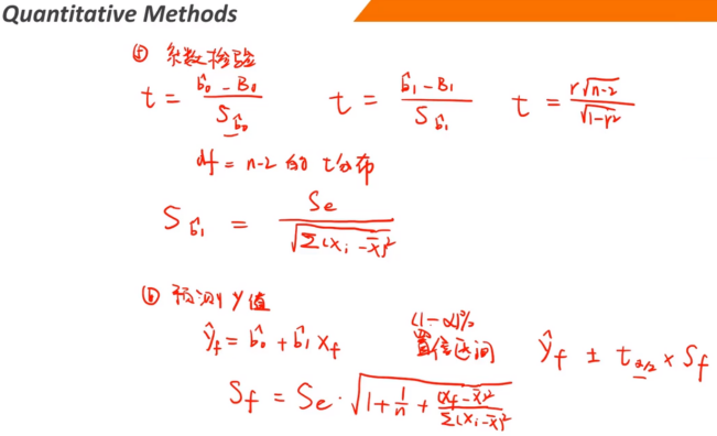 检验斜率是否等于某个值B1使用t检验(df = n - 2) 拒绝原假设,说明斜率显著不等于B1 当原假设是b1 = 0时,拒绝原假设代表Y与X明显相关