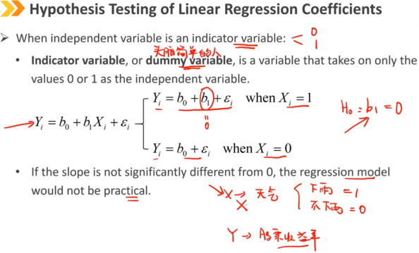 当自变量是哑变量时,如果斜率不能显著区别于0,则这个回归模型不能使用,自变量选择有误