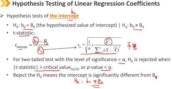 检验截距是否等于某个值B0使用t检验(df = n - 2) 拒绝原假设说明截距显著不等于B0
