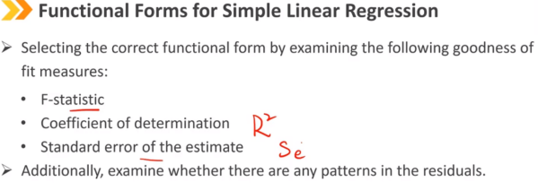 通过检查以下拟合优度度量来选择正确的函数形式: F-统计量 决定系数R^2 估计的标准误差se 此外,检查残差中是否存在任何趋势变化