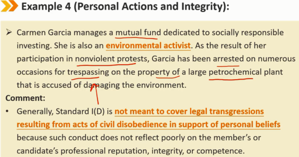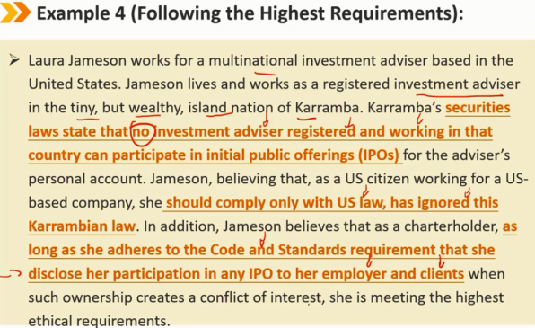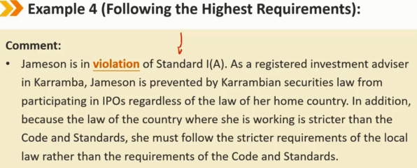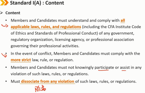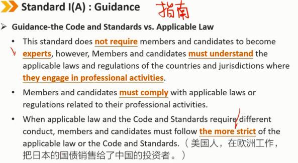 会员和候选人必须了解并遵守任何政府、监管机构、许可机构或专业协会管理其专业活动的所有适用法律、法规和条例(包括CFA协会道德规范和职业行为标准)。