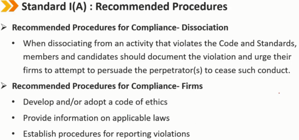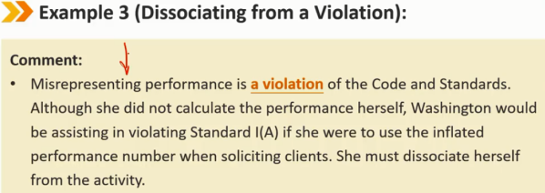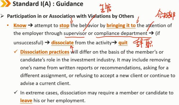 参与或与他人的违法行为有关 了解违法行为 -> 通过主管或合规部门提请雇主注意,试图阻止该行为 -> 如果不成功 -> 脱离活动 -> 辞职 根据会员或候选人在投资行业中的角色,脱离做法将有所不同。它可能包括从书面报告或建议中删除某人的姓名、要求另一项任务、拒绝接受新客户或继续为当前客户提供建议 在极端情况下,脱离可能要求成员或候选人离职