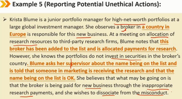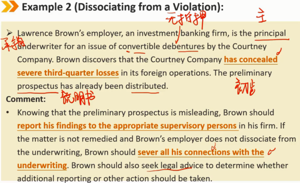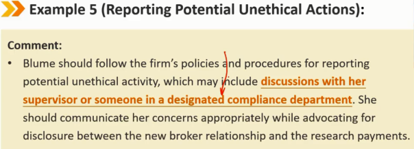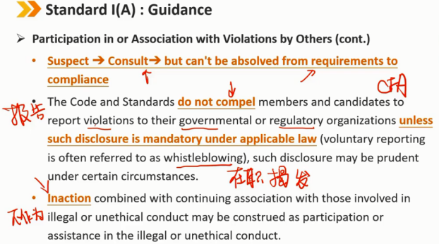 参与或与他人的违法行为有关(续) 怀疑违法 -> 咨询 -> 但不能免除自身未履行合规要求的责任 该准则和标准不强制会员和候选人向其政府或监管机构报告违规行为,除非根据适用法律,此类披露是强制性的(自愿报告通常被称为在职揭发),在某些情况下,此类披露可能是谨慎的。 不作为加上继续与参与非法或不道德行为的人交往,可被解释为参与或协助非法或不道德行为。