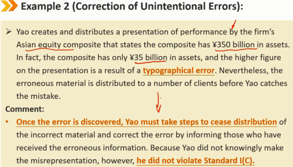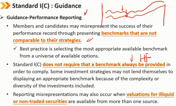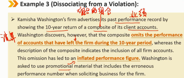 指南——不当陈述的定义(续) 保证投资业绩: 禁止:保证客户在不稳定的投资中获得任何特定回报。保证特定的回报率或保证投资资本的保值(例如,“我可以保证你今年的股票收益率为8%”或“我可以保证你不会在这项投资中亏损”)对投资者是误导性的 不禁止:会员和候选人向客户提供有关投资产品的信息,这些产品本身的通过结构化投资的方式进行担保,或者机构已同意为其弥补任何损失