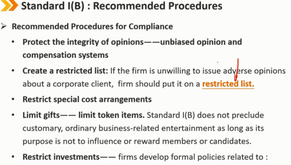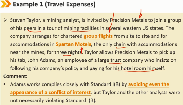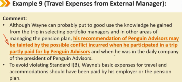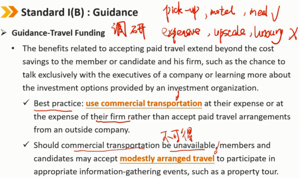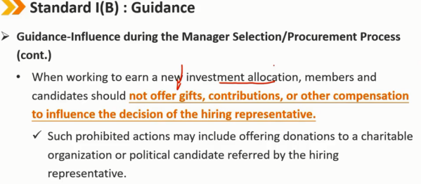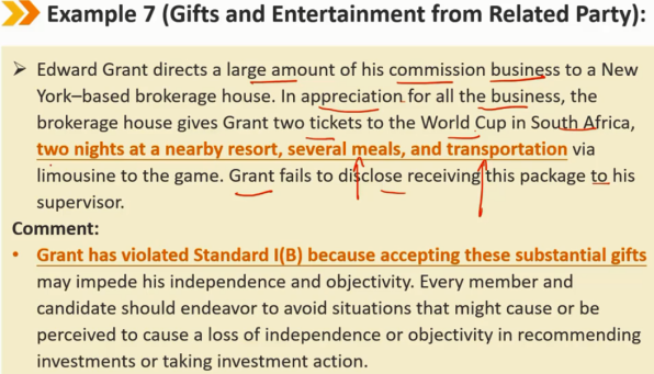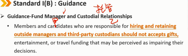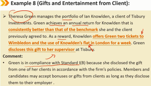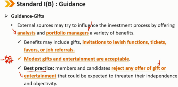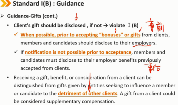 指南——礼物(续) 客户的礼物应该被披露,如果没有 -> 违反Ⅰ(B) 在可能的情况下,在接受客户的“奖金”或礼物之前,会员和候选人应向雇主进行事前披露 如果在接受之前无法通知,会员和候选人必须事后向其雇主披露之前从客户处接受的福利 从客户处收到礼物、利益或好处,可以与试图影响会员或候选人而损害其他客户利益的实体提供的礼物区分开来。客户的礼物可以被视为补充补偿,即收到的礼物或者好处不能损害到其他客户的利益。