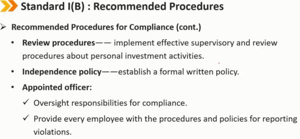 建议的合规程序 道德规范:制定和/或采用每位员工都必须遵守的道德规范,并明确表示不会容忍对相关个人、整个机构或投资行业造成不良影响的任何个人行为 违规清单:向所有员工分发一份潜在违规清单和相关的纪律处分,直至公司解雇 员工推荐信:检查潜在员工的推荐信,确保他们品行良好,并且不会因为过去的违法行为而没有资格在投资行业工作