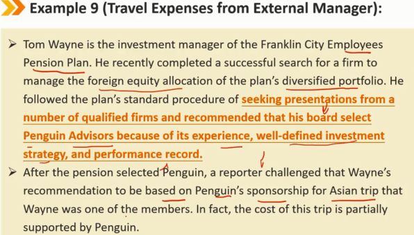 负责选择外部经理和第三方保管机构的会员和候选人不应接受可能被视为影响其决策的礼物、娱乐或旅行资金。
