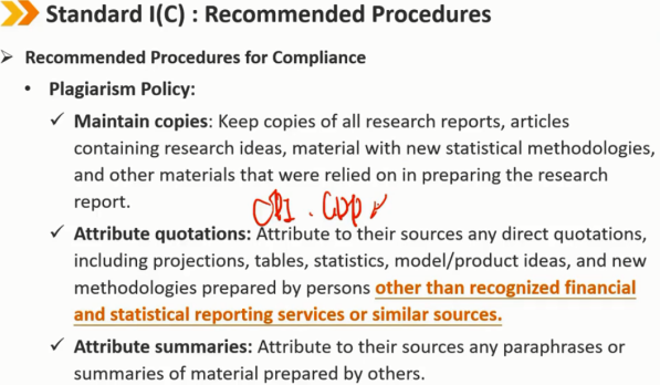 建议的合规程序 剽窃政策: 保留副本:保留所有研究报告、包含研究想法的文章、采用新统计方法的材料以及编制研究报告所依赖的其他材料的副本。 属性引用:将任何直接引用归因于其来源,包括预测、表格、统计、模型/产品想法,以及由认可的财务和统计报告服务或类似来源以外的人员编制的新方法。 属性摘要:将他人准备的材料的任何释义或摘要归因于其来源。