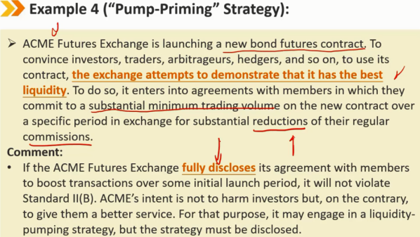 例如,会员和候选人必须避免通过发布误导性正面信息或对证券价值的过度乐观预测来“推高”投资价格,而只是在价格上涨后“抛售”投资,这是由于误导性信息对其他市场参与者的影响,达到人为的高水平。